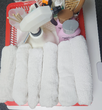 시험에서는 수건이 풀리지 않도록 안정적인 형태로 감싸는 것이 중요합니다.