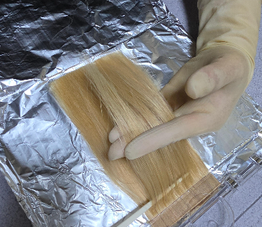 컬러링 시험에서는 모발을 얇게 떠서 여러 개의 피스로 나누게 됩니다.